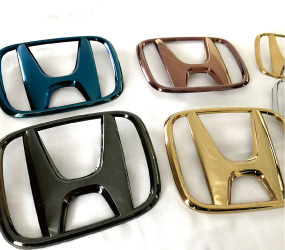 当加工技術の最大の特長は、世界で初めて、低温での処理を可能とすることから、世の中にあるほとんどの固体(金属、プラスチック、ゴム、ガラス、紙、陶磁器、繊維、木材など)にイオンプレーティング皮膜をつけることができる点にあります。さらに、金属膜のみならずセラミック膜としてコーティングすることができるため、従来の着色技術と比較しても抜群の強度や耐久性を発揮。HONDA全車種のオプションカラーエンブレムに採用されています。