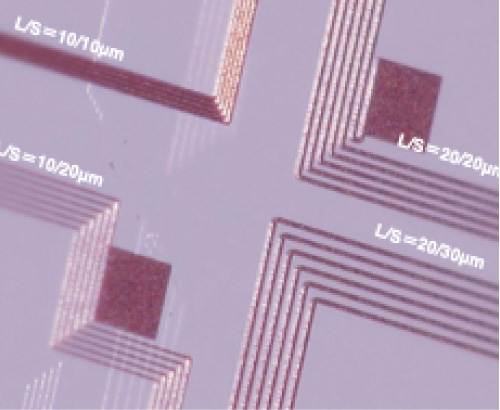 また、10μmレベルの微細配線や電極を銅めっきで形成する技術や、Φ50×400μm深さのビアへの銅めっき埋め込み技術は、MEMSセンサーデバイスや半導体パッケージなどの高精度製品向けに活用されています。