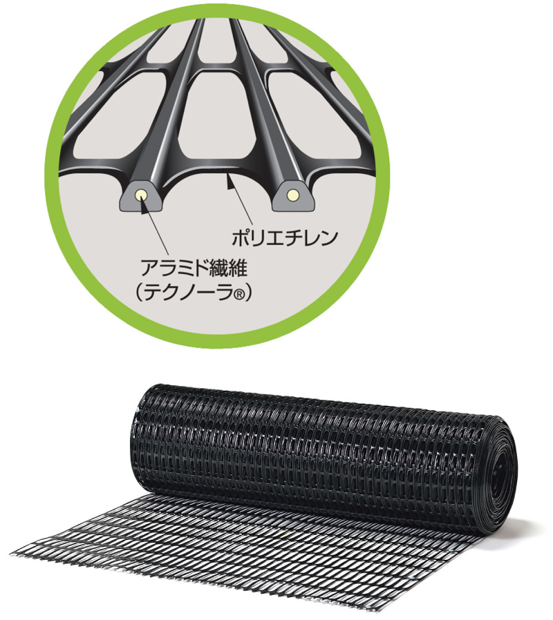 平野部が少なく雨の多い日本では、盛土・地盤補強による土地の有効利用と災害の未然防止が、土木分野の大きなテーマになっており、それらを解決するために高分子材料からなる高強力の格子状ネット(一般名称:ジオグリッド)が使用されています。従来製品は、伸びが大きいために盛土の変形抑止効果が小さく、また、石混じりの土に使用するとその衝撃でネットが破損するという欠点がありましたが、当社のジオグリッドは、ポリエチレン製の格子状ネットに、高強力・低伸度のアラミド繊維を挿入することで、これらの欠点を克服。伸びが小さいために変形抑止効果が大きく、耐衝撃性が高いため使用する土質に関係なく盛土を健全に保持することができます。この構造が盛土や地盤の補強に適していることを実験的に見出し、(一財)土木研究センターの建設技術審査証明を取得するなど、安心して使用できる材料として高い評価を受け、全国の道路に1万件以上の使用実績があります。
