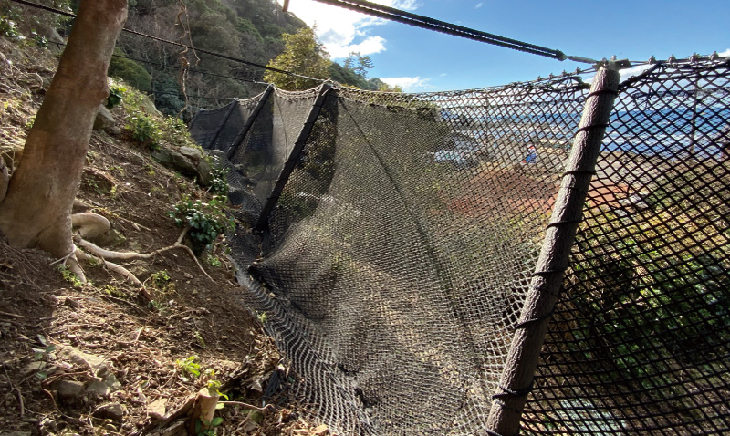 当社は、従来の繊維ネットにはない極太ラッシェル網地と、高強度でありながら高い伸度をもつロープを組み合わせた「ネイチャーネット」を主材料とし、その他構成部材にも特殊繊維を使用したフェンス構造体を開発しました。フェンス自体に柔軟性をもたせることで、繊維でありながら150kJまでの高エネルギーの落石にも対応できる、従来の鋼製落石防護柵にない新しいタイプの防護柵です。軽量で作業員の負担軽減につながるほか、設置時・メンテナンス時の低コスト化を実現しています。