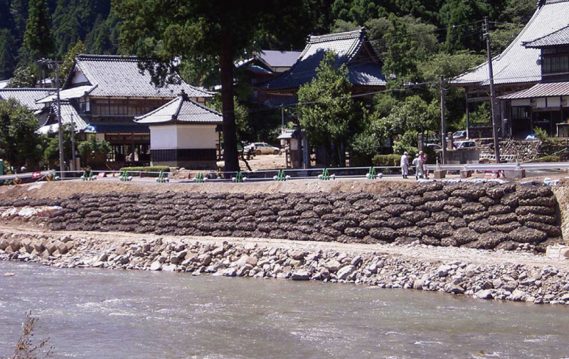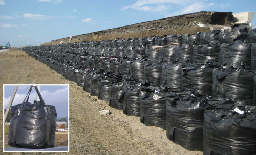 従来の土木工事用仮設土のうには、フレキシブルコンテナバッグが使用されてきましたが、穀物など粉粒状貨物の輸送用に作られたため、長時間の屋外設置や土砂の充填に耐えうるものではなく、2004年に発生した福井豪雨の復旧工事でも2か月程度で劣化が進み、吊り下げ撤去ができないという問題が発生しました。この経験から、数年間の耐久性を有する「ツートンバッグ」を開発しました。原糸に練り込まれた紫外線吸収剤が化学繊維の劣化を抑制するため、災害復旧工事や備蓄など様々な用途で長時間設置後でも移動や転用が可能な耐候性に優れた土のうとして活躍しています。(「耐候性大型土のう積層工法」設計・施工マニュアル[第2回改訂版]〈(一財)土木研究センター〉性能評価証明取得。(NETIS 登録番号KT-060144-V)※掲載期間終了)