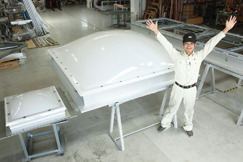 さらに、排煙装置一体型のため、商業施設、公共施設、工場など建築基準法や消防法で定められる排煙面積を屋根で対応することも可能です。当製品を使用することで、小さい排煙装置や、壁に窓を多数設置するよりも結果的に低コストとなります。また、工期の縮小も可能で、建設現場の人手不足にも貢献。今後、さらに大型の製品開発を目指してまいります。