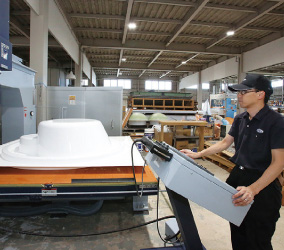 当社はFRP・FRA成形技術を活かした製品づくりに日々力を注いでいます。従来から保有している押出成形技術や、大きなプラスチックの「一体製品」を提供できる真空成形技術を駆使し、創業以来、分野にとらわれない製品開発を行っています。金型の製作、成形条件、独自に製造した国内最大の大型真空成形機や遠心重合技術という独自の製造技術など、顧客と時代のニーズに沿った創造と挑戦を続けています。
