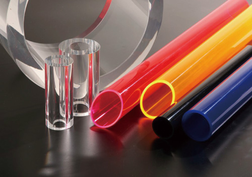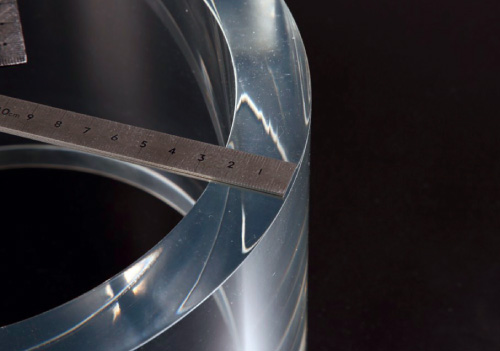 従来の大口径アクリル樹脂パイプ(φ600mm以上)は、アクリル板の曲げ加工を行い、接着して製作するため、接着部分に線状のつなぎ目(ダイス線痕)が発生しています。