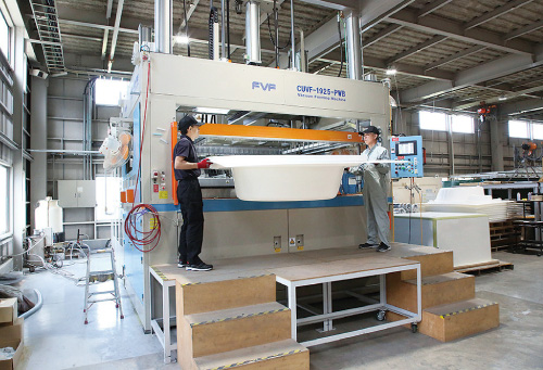 従来の樹脂製浴槽はガラス繊維強化プラスチック(FRP)が主流ですが、これまでに培った真空成形技術と、独自に製造した国内最大の大型真空成形機を用いて、ガラス繊維強化プラスチックとアクリル樹脂の複合材であるFRAでの大型浴槽の製造に成功しました。