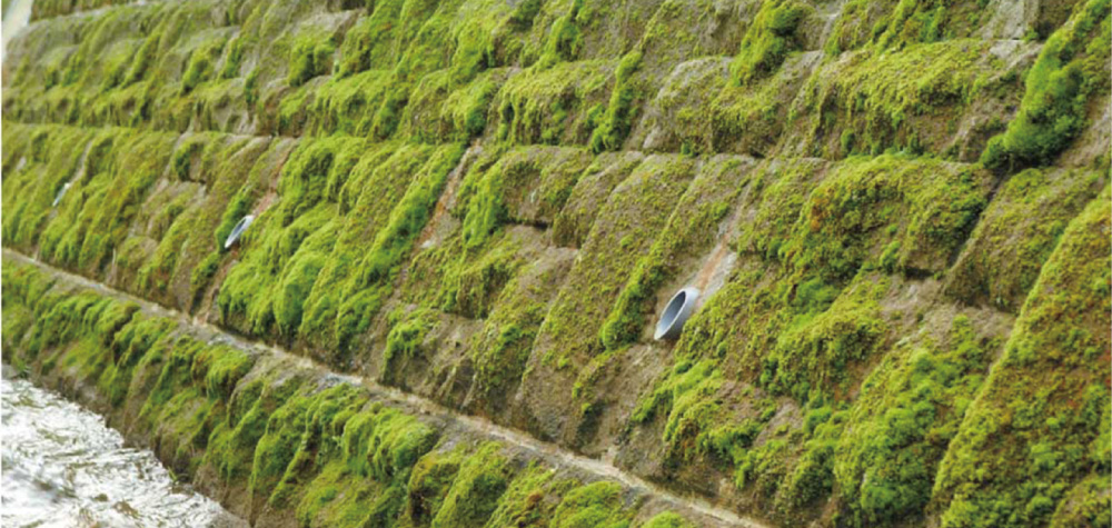 従来、コンクリートは強アルカリ性で強固なため、表面に直接植生させるのは不可能でした。当社はこの常識を覆し、コンクリート製品の製造技術やノウハウを基に、植物活性材(J-Wish)、人工ゼオライトをセメントで練り固め、土のように無数の微細孔を有するポーラス構造とすることで、弱アルカリ性で吸水性、保水性、保肥性に優れ、苔や藻類が早期に自生できる多孔質なコンクリート(商品名:JBロック)を開発しました。