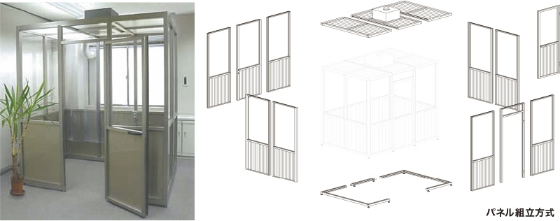 分煙化が推進される中、非喫煙者と喫煙者が同一のオフィス内、工場内などで快適に共存することを可能とする喫煙ボックスです。アルミフレーム枠のパネル組立方式なので、狭い間口からの搬入・設置や、高層階施設内への搬入・設置も低コスト・短時間で行えます。