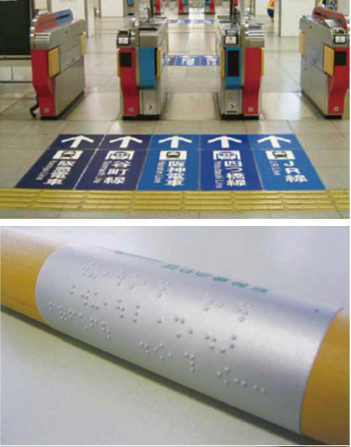 「PCテンボスシート」はポリカーボネート製で裏面から点字を打刻する、視覚障害者にも対応できる点字サインで、表面に汚れ防止の特殊コートを施しています。手すり以外にも設置可能で、両製品ともに大阪駅構内やホームなど、JR西日本の各駅を中心に、路上や駐車場など、様々な場所で活用されています。