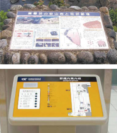 駅や道路、観光名所や文化財など、様々なところに「サイン」(案内板や誘導標)が設置されています。当社は、これらの様々な「サイン」を企画・製造・施工しています。創業以来培ってきたノウハウと印刷技術をもとに、すべて自社で開発した「サカイシルクだけの製品」を提案。傷や摩耗、汚れに強く、永く色彩を保つことができるうえ、撥水コート処理により、降雨などによるセルフクリーニング効果で清掃が容易な点も、日本全国に設置されているポイント。文化財や公共施設などのサインとして、半永久的に後世の人々に「伝える」お手伝いをしています。また、どなたでも使いやすく解りやすいユニバーサルデザインへの対応として、JIS規格に準じた品質で、専門家による触読監修も整えた責任製作を行っています。