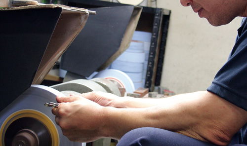 当社の理容・美容用のハサミはおよそ100数種類あり、そのほぼ全てが個別受注生産によるものです。理容・美容の競技技術者や一日に何十人もの髪の毛をカットするプロの技術者のハイレベルな要求に応えている当社のハサミは、熟練した職人が高い技術力で一丁一丁手作りで仕上げています。特にその技術のベースとなっているのが刃の裏側に微妙なひねりを生み出す「裏スキ加工」で、当社は国内で唯一、完全手スキにより裏スキ加工できる技術を持っています。