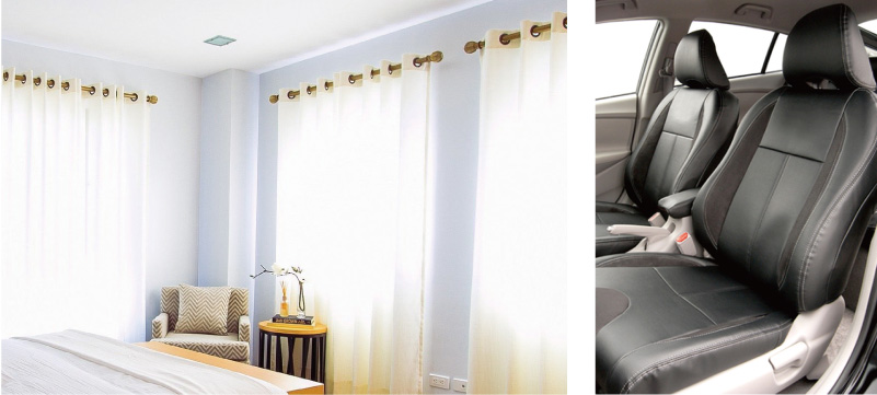 ホテルや病院など不特定多数の人が集まる施設で使用するカーテンは災害時の安全対策として、消防法で定められた防炎性能基準を満たしていなければなりません。当社は独自で開発した特殊な界面活性剤と分散技術を駆使し、カーテンなどの繊維製品に防炎性能を付与する防炎加工剤を製造・販売しています。同薬剤は人体や環境に配慮した原料を使用しており、カーテン類のみならず、自動車、電化製品等幅広く使用され、国内シェアナンバーワンを誇っています。カーテンなどの繊維製品は、洗濯を繰り返しても同等の防炎性能を維持する洗濯耐久性が求められます。当社の防炎加工剤は、防炎カーテンに用いられるポリエステル繊維を染色加工する際に、染料と同様に繊維内部に吸収されるため、高い洗濯耐久性を有しています。また防炎加工の際に発生する生地の染色ムラや染色機械の汚れといったリスクを低減するよう設計しているため、加工時のトラブルも防止できます。