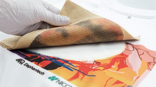 ポリエステル繊維から大掛かりな装置を使わず染料を即時に取り除くことができる世界初めての、オンリーワンの技術です。水を必要とせず有害な化学物質も使わないため、廃水も出ません。ポリエステル繊維製品の昇華転写プリント装置で脱色ができるため、脱色と再プリントを連続して同時に実施でき、何度も繰り返すことも可能です。必要な部分だけを選択的に脱色することもできます。繊維製品の環境負荷の問題を改善する手段として、プリント内容が陳腐化して廃棄される素材を容易にリユースすることができる技術として広く注目され、将来性を期待されています。経済産業省の「繊維製品の環境配慮設計に関する事例集」(2023)に水資源への配慮として掲載。用途に合わせた専用装置の開発も進んでおり、サイネージ布や人工毛髪の部分脱色等への応用の広がりが期待できます。