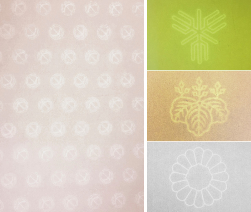 一見しただけでは何の特長もない紙ですが、裏面から光をあてることにより白く模様や文字が現れる…これが透かしマークと言われるもので、商品券、優待きっぷなどの金券類や卒業証書、免状、名刺、神社の御札の用紙などに使用されています。当社は、このような透かしマーク入りの和紙を生産しています。