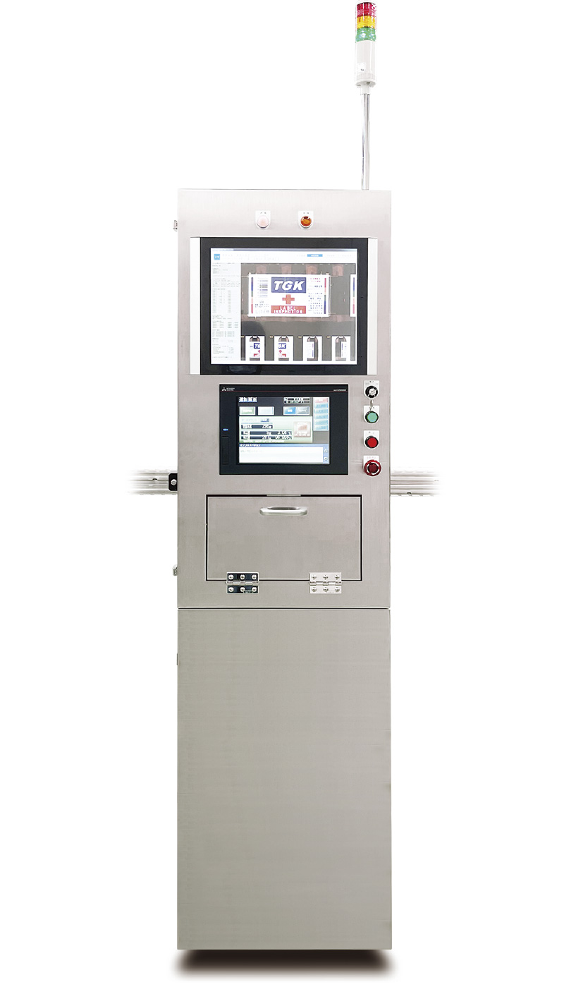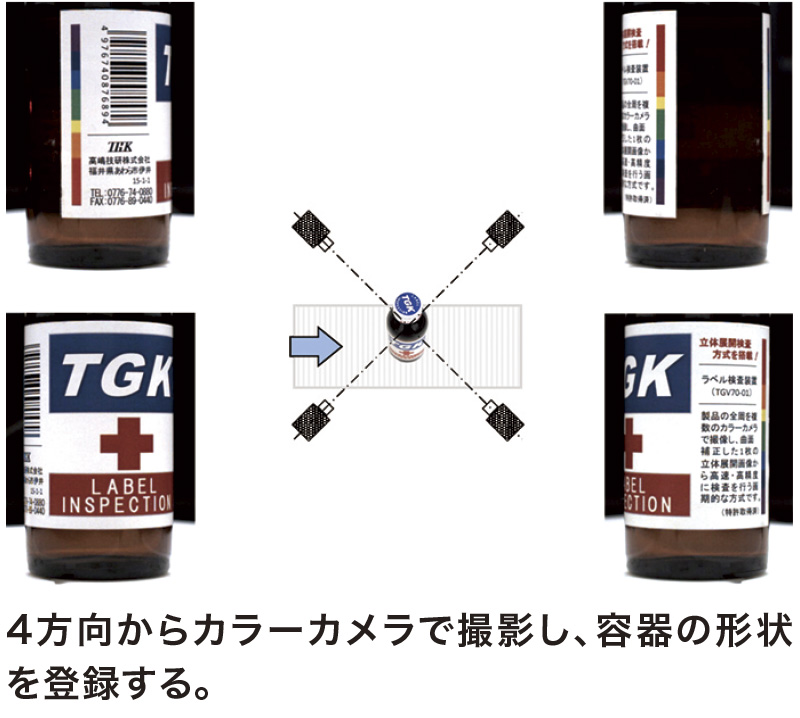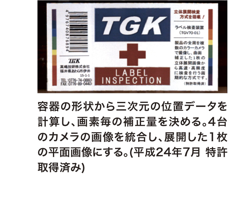 ラベルが貼られたボトル製品(びん、缶、PET)等の外観を複数のカメラで撮像し、容器の形状・遠近歪等の補正によりひずみのない画像で自動検査する「立体展開検査方式」によって、従来の検査では困難だった比較的小さな破れ、汚れ、印刷不良などの欠陥を検出することが可能です。