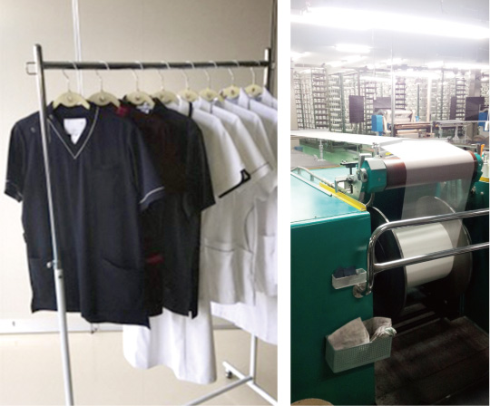 当社の製品は、吸汗性や通気性に優れる綿と電気を瞬時に逃す導電糸が混合され、経編トリコットにより柔らかい肌合いと伸縮性を実現。メディカル白衣(看護衣)の経編トリコットでの国内シェアナンバーワンを誇り、市場にて評価いただいています。