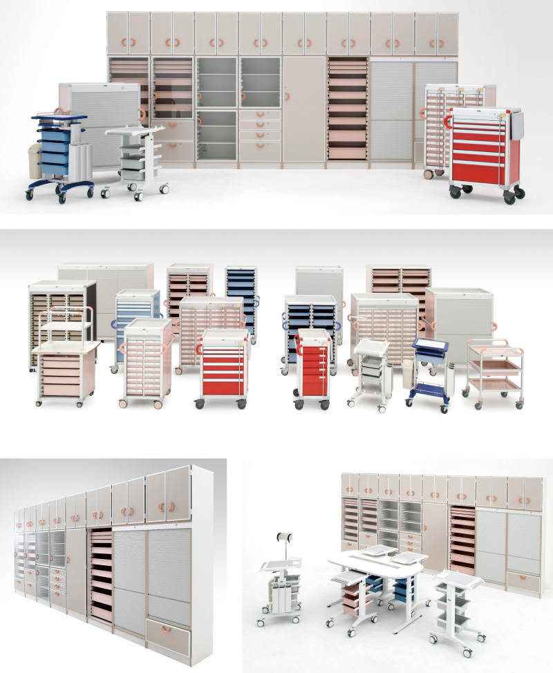 当社は、独自のプラスチック加工技術、金属加工技術、木材加工技術をフルに活用し、医療用キャビネットやカートを全国の病院に供給し、国内シェアナンバーワンを確立。病院内の物流の省力化に大きく貢献してきました。
